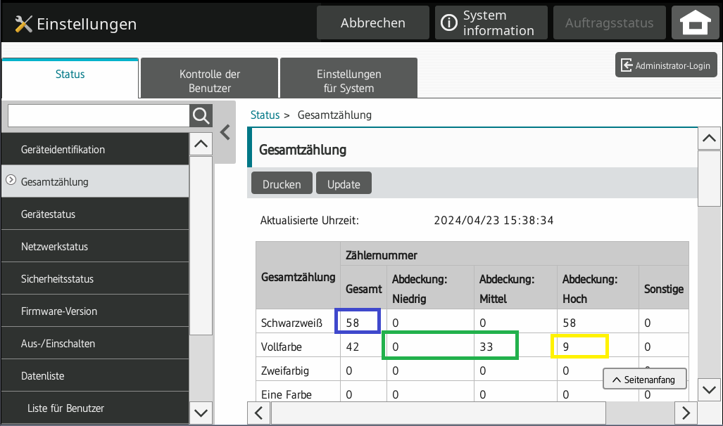Zähler color ab 10% Farbdeckung: siehe Abdeckung Hoch (hier gelb markiert)